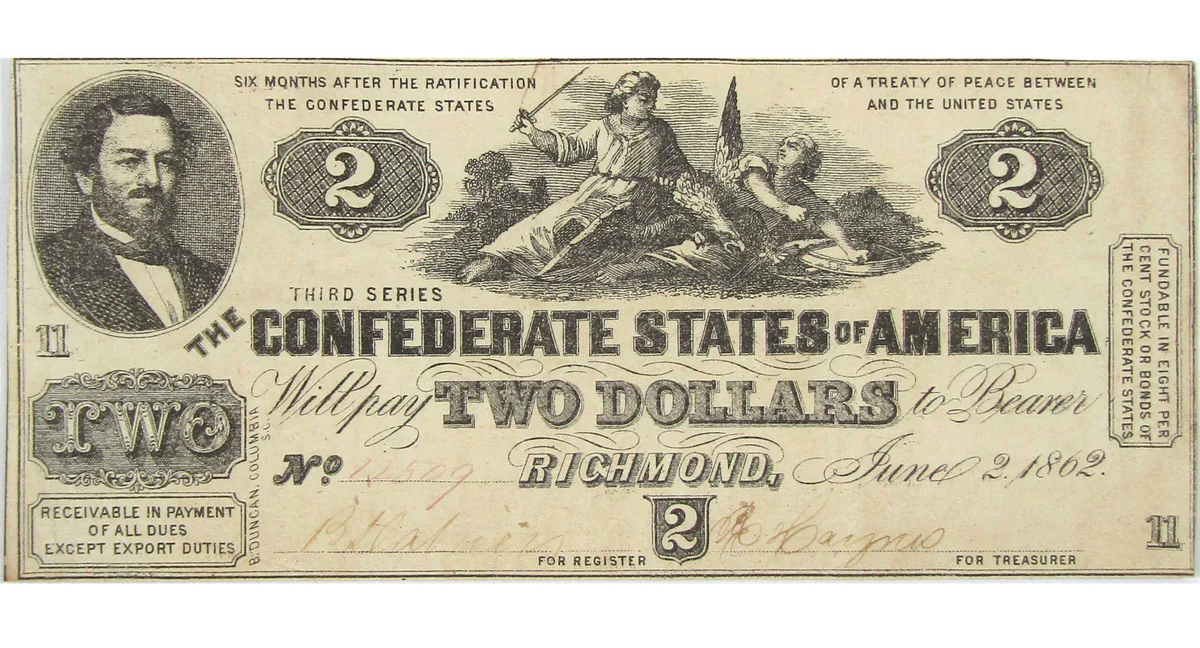 A genuine 1862 $2 Confederate Note, T42, in Extremely Fine or Better Condition