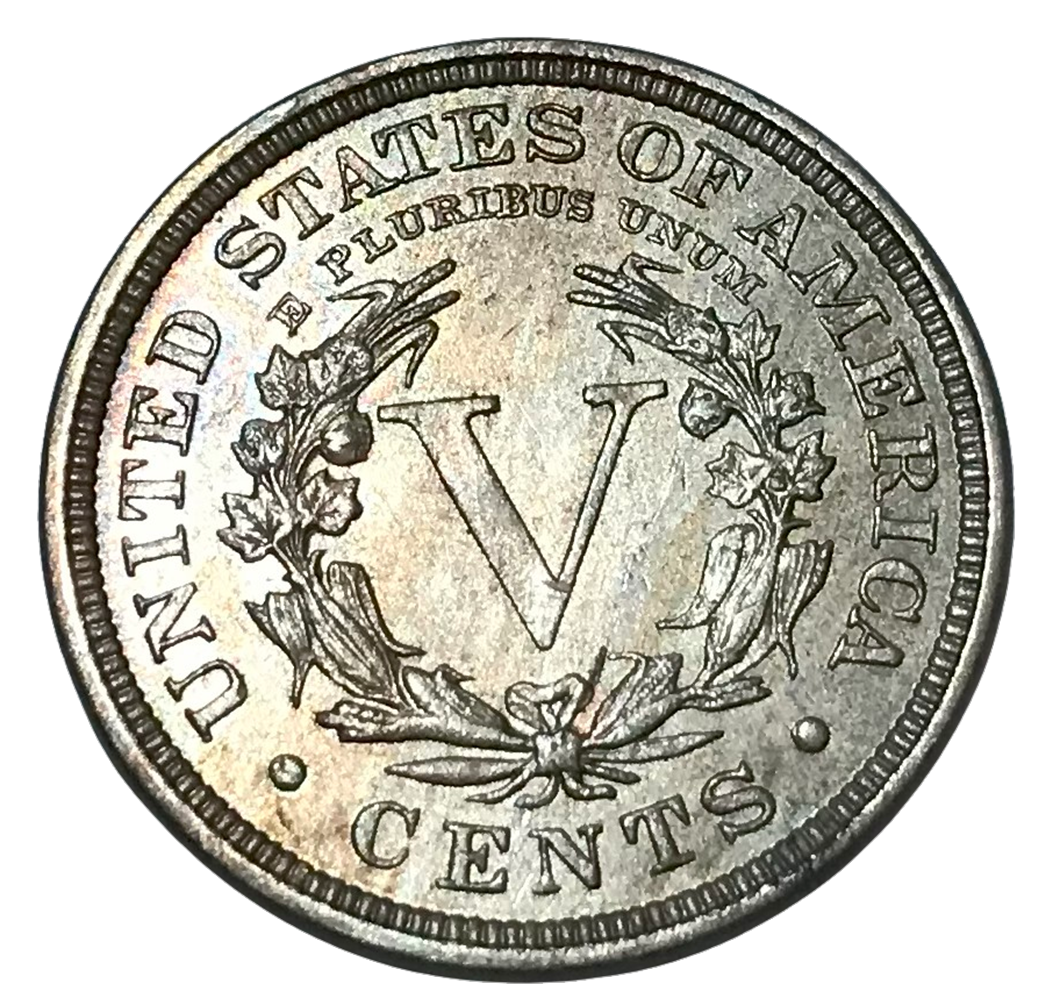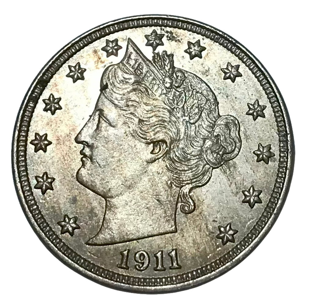 Liberty Head nickels of 1883-1912 bear a classic portrait of Liberty, which the coins designer Charles E. Barber based on a Greco-Roman marble sculpture. Liberty is depicted wearing a coronet, and is surrounded by 13 stars representing the original colonies. The reverse features a large Roman numeral V (five) encircled with an agricultural wreath of wheat, corn and cotton. The historic 1911 Liberty Head nickel was struck at the Philadelphia Mint over 95 years ago.