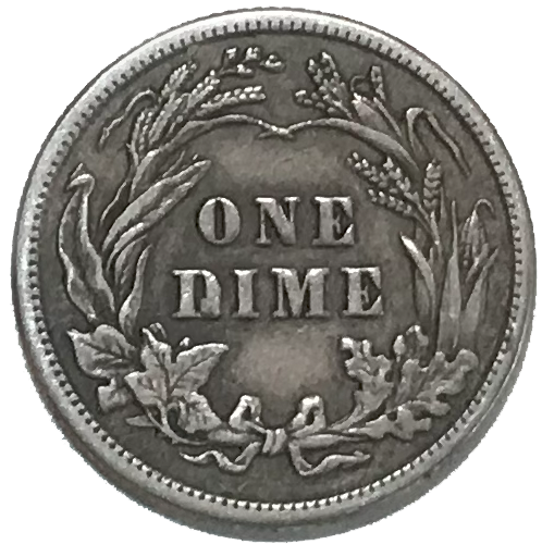 This 90% silver dime displays Charles Barber`s classic Liberty Head design. The obverse shows Liberty in a Phrygian cap with a laurel wreath - the same obverse design he used for the quarter and half dollar of that era.