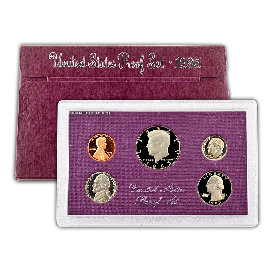 This 1985 Proof Set includes the following 5 coins:Lincoln Cent, Jefferson Nickel, Roosevelt Dime, Washington Quarter, Kennedy Half Dollar