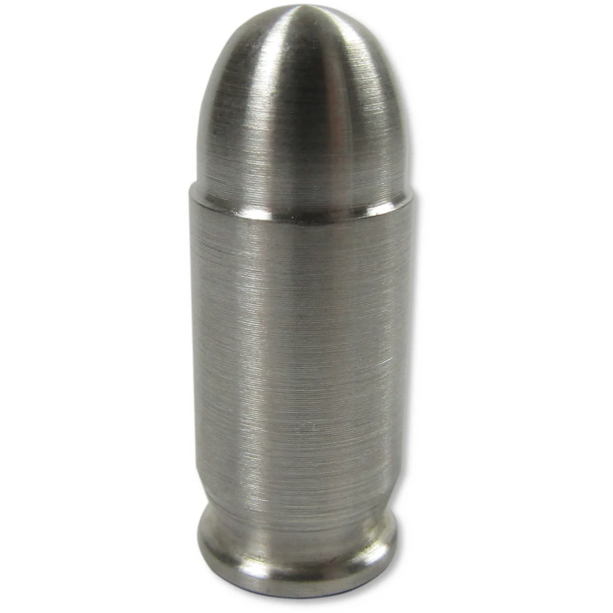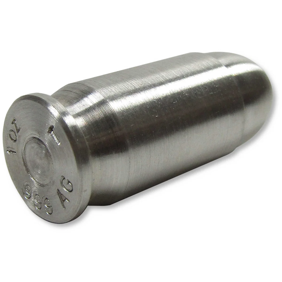 This bullet-shaped piece contains one oz. of 99.9% pure silver and is modeled after ammunition for the .45 Caliber Automatic Colt Pistol (not intended for actual use in a weapon). Each bullet measures 30.6 mm tall (1-7/32") and 12.1 mm wide (1/2"), and features the base engraving 1 oz. .999 Ag.