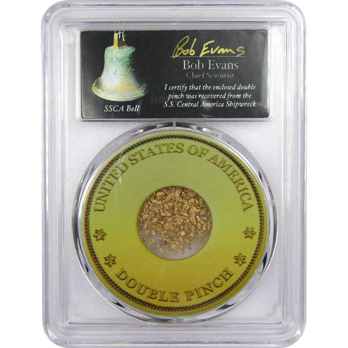 A double pinch of California Gold Dust recovered from the S.S. Central America Ship of Gold shipwreck. Encapsulated in a PCGS holder, signed by Chief Scientist Bob Evans